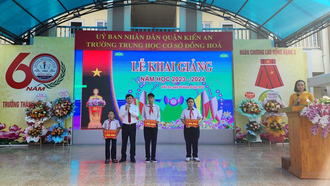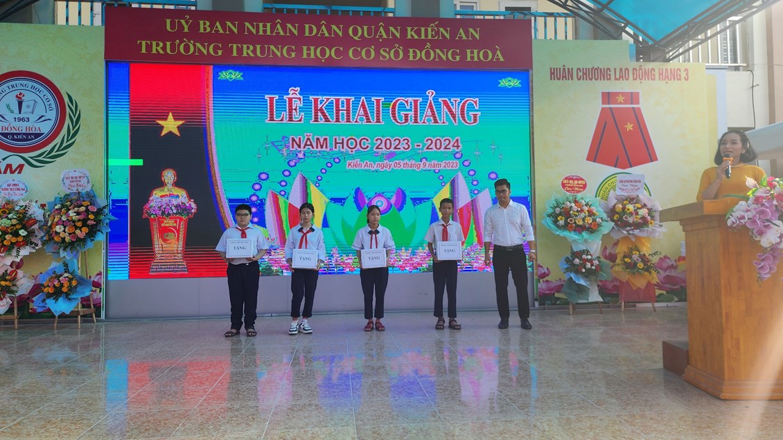 Trong buổi lễ, 20 suất học bổng của công ty du lịch S9 đã được trao tặng cho các em học sinh có thành tích xuất sắc trong học tập; 4 CBGV có thành tích trong công tác ôn thi vào 10, ôn thi HSG được biểu dương khen thưởng; 05 học sinh có hoàn cảnh khó khăn được nhận quà của UBND quận nhân dịp khai giảng năm học mới.
